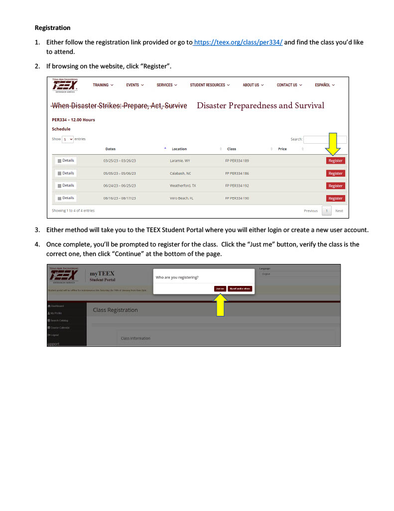 Below you will find the registration link for the TEEX PER334 Disaster Preparedness and Survival. There is also an attached Course Flyer, a document on how to register, and a document on how to download course materials.