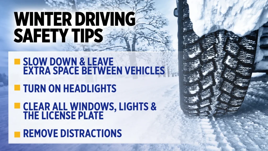 • Drive slowly: Reduce your speed and allow for longer stopping distances, as it takes longer to stop on icy or snowy surfaces.