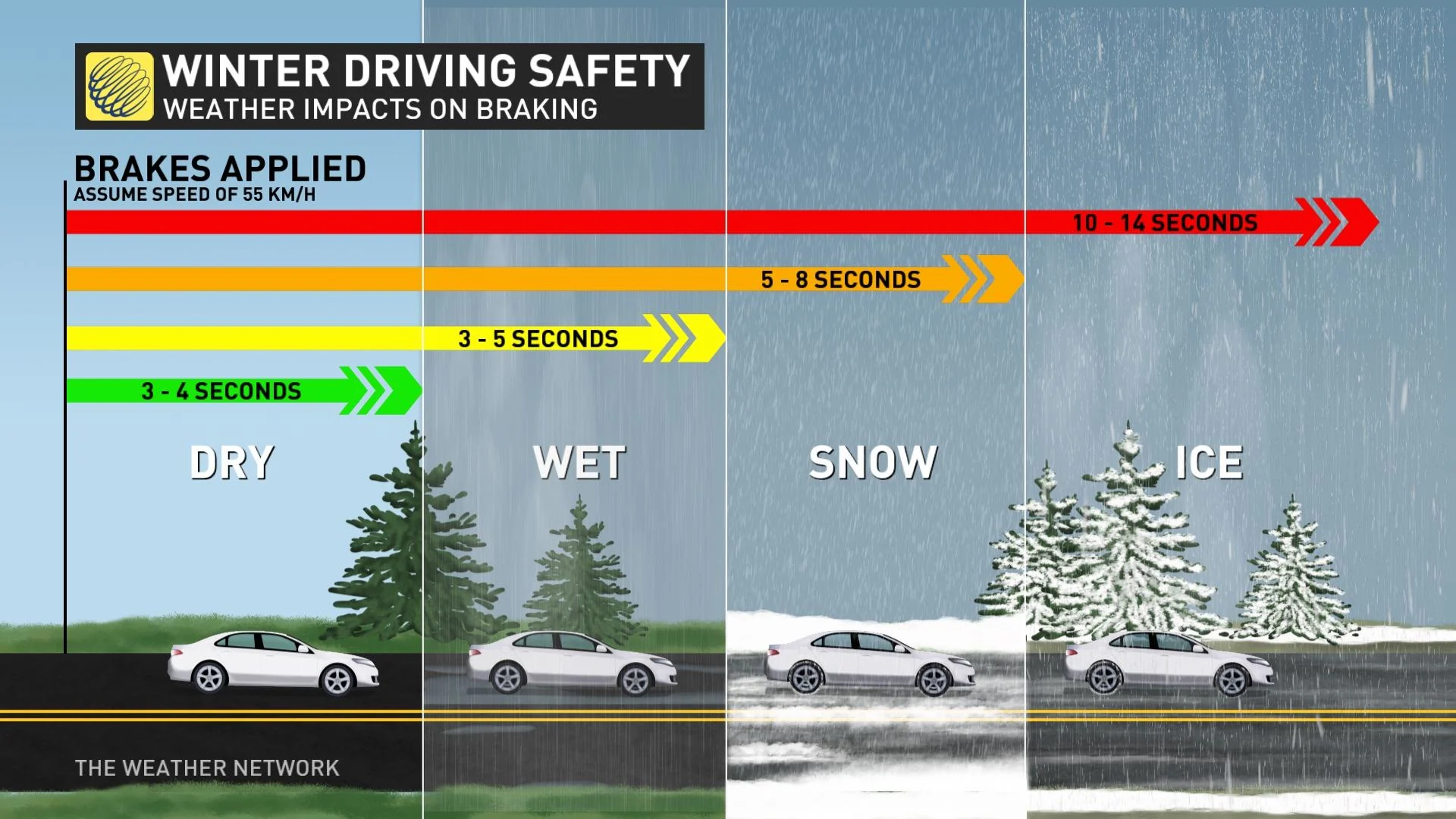 • Drive slowly: Reduce your speed and allow for longer stopping distances, as it takes longer to stop on icy or snowy surfaces.